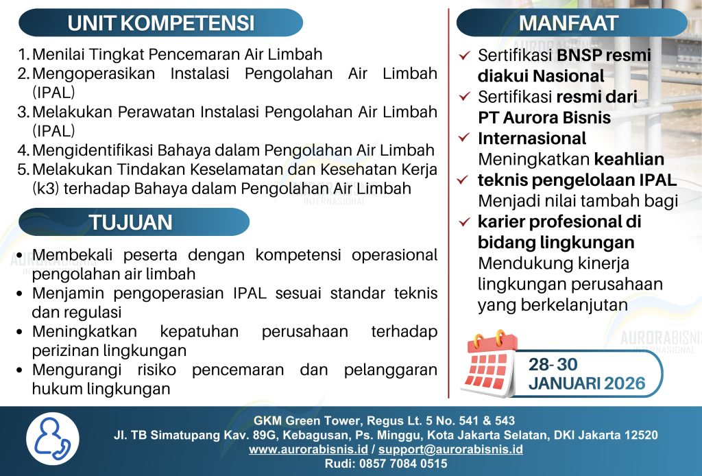 PT Aurora Bisnis Internasional menghadirkan Pelatihan dan Sertifikasi BNSP Penanggungjawab Operasional Pengolahan Air Limbah (POPAL) bagi para operator, teknisi, dan supervisor yang bertanggung jawab atas kinerja Instalasi Pengolahan Air Limbah (IPAL). Program ini dirancang khusus untuk menguatkan kompetensi teknisi inti seperti pengoperasian dan perawatan IPAL, penilaian tingkat pencemaran, identifikasi bahaya, serta penerapan prosedur K3 di lapangan — sesuai dengan persyaratan teknis UU No. 32 Tahun 2009 tentang Perlindungan dan Pengelolaan Lingkungan Hidup.