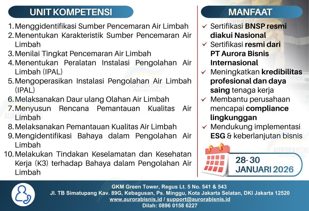 PT Aurora Bisnis Internasional sebagai Lembaga Sertifikasi Profesi resmi menyelenggarakan program Pelatihan dan Sertifikasi BNSP Penanggungjawab Penendalian Pencemaran Air (PPPA). Program ini dirancang untuk memenuhi kebutuhan nasional akan tenaga ahli yang kompeten dalam mengelola pencemaran air limbah sesuai dengan standar regulasi lingkungan seperti Permen LHK No. P.68/2016. Dengan kurikulum lengkap 10 unit kompetensi — mulai dari identifikasi sumber pencemar, operasional IPAL, hingga pemantauan kualitas air — peserta dibekali kemampuan menyeluruh untuk mengendalikan risiko lingkungan secara efektif.